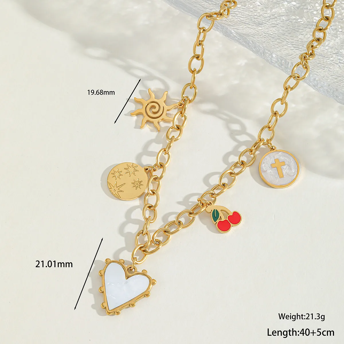 Whimsical yet refined, this charm necklace combines sun and heart motifs for a playful romantic feel. Crafted from 304 stainless steel and finished in luminous 18K gold plating, it features acrylic, imitation pearl, and zircon details for added texture and sparkle.