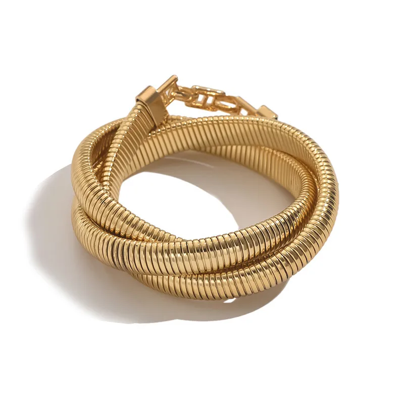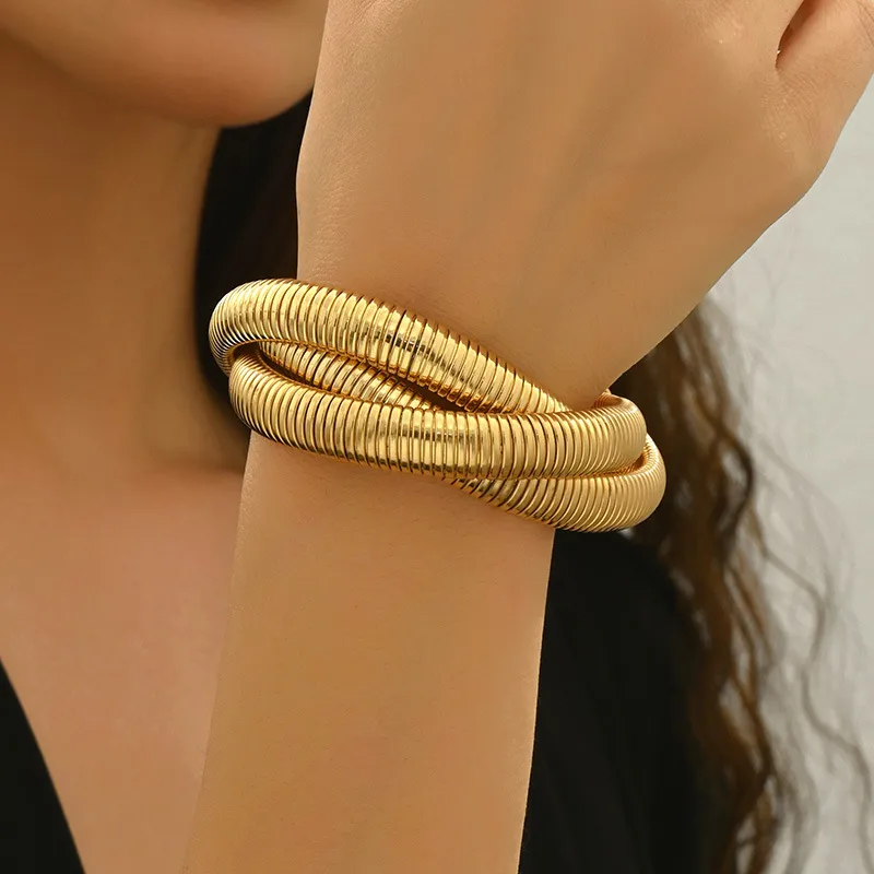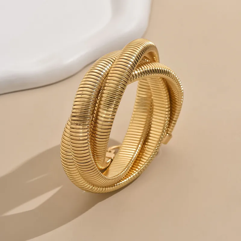 A bold retro-inspired geometric bangle with luxurious 18K gold plating.