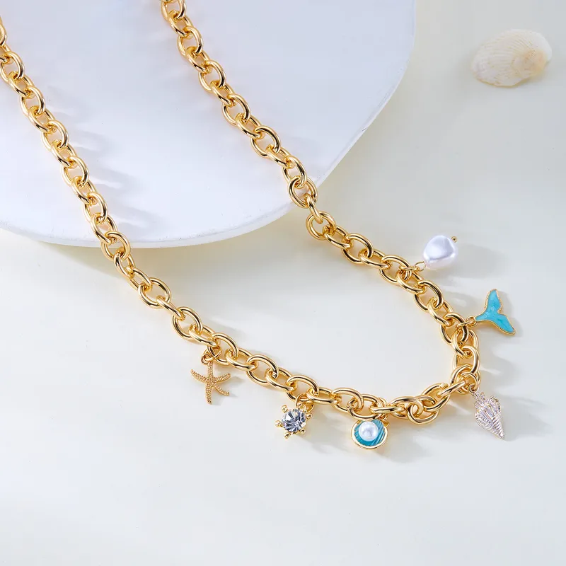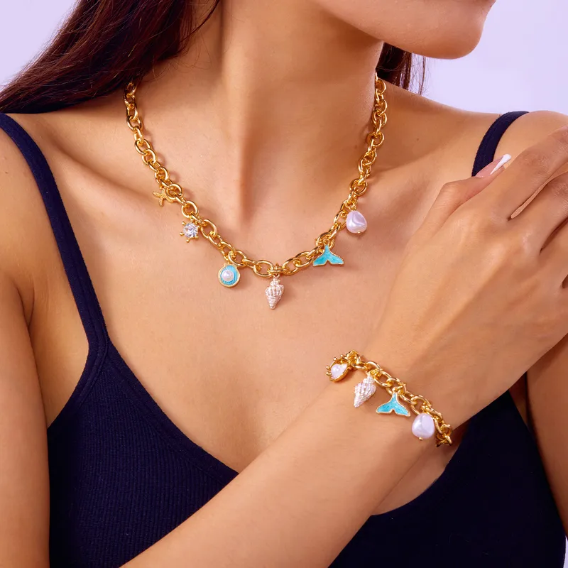 This shiny gold-plated necklace showcases ocean-inspired charms including conch shells and fish tails. Crafted from alloy and iron with shell and pearl-inspired accents, it brings vacation-ready elegance to your jewellery collection. Perfect for holiday styling, it adds a playful yet sophisticated seaside touch.