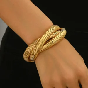 A bold retro-inspired geometric bangle with luxurious 18K gold plating.